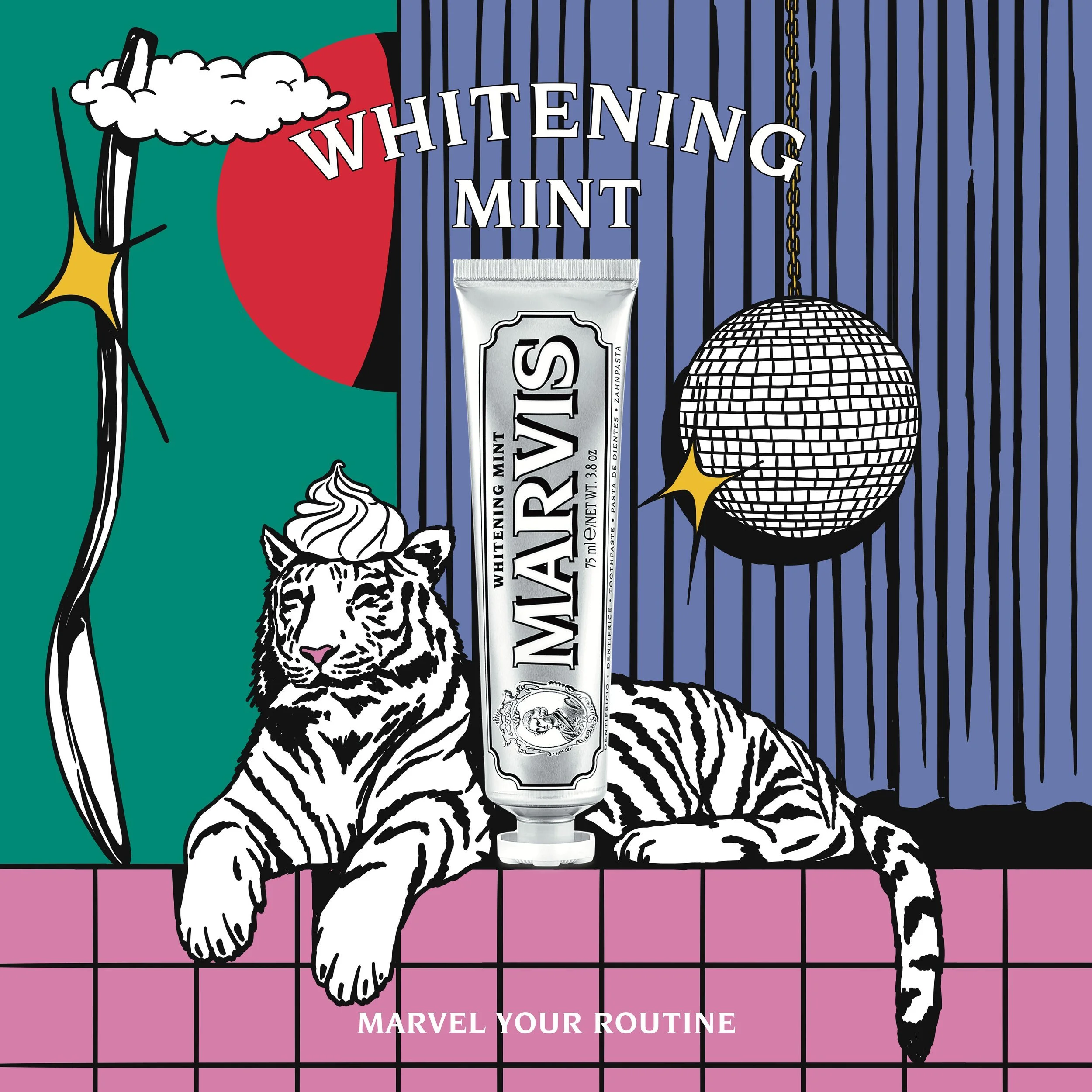 As part of the ongoing ‘Marvel Your Routine’ campaign, Marvis fell in love with Andrey’s ironic and poppy style and invited him to tell the story of the Whitening flavour with a strong key visual and animation film, for all social media channels worldwide.