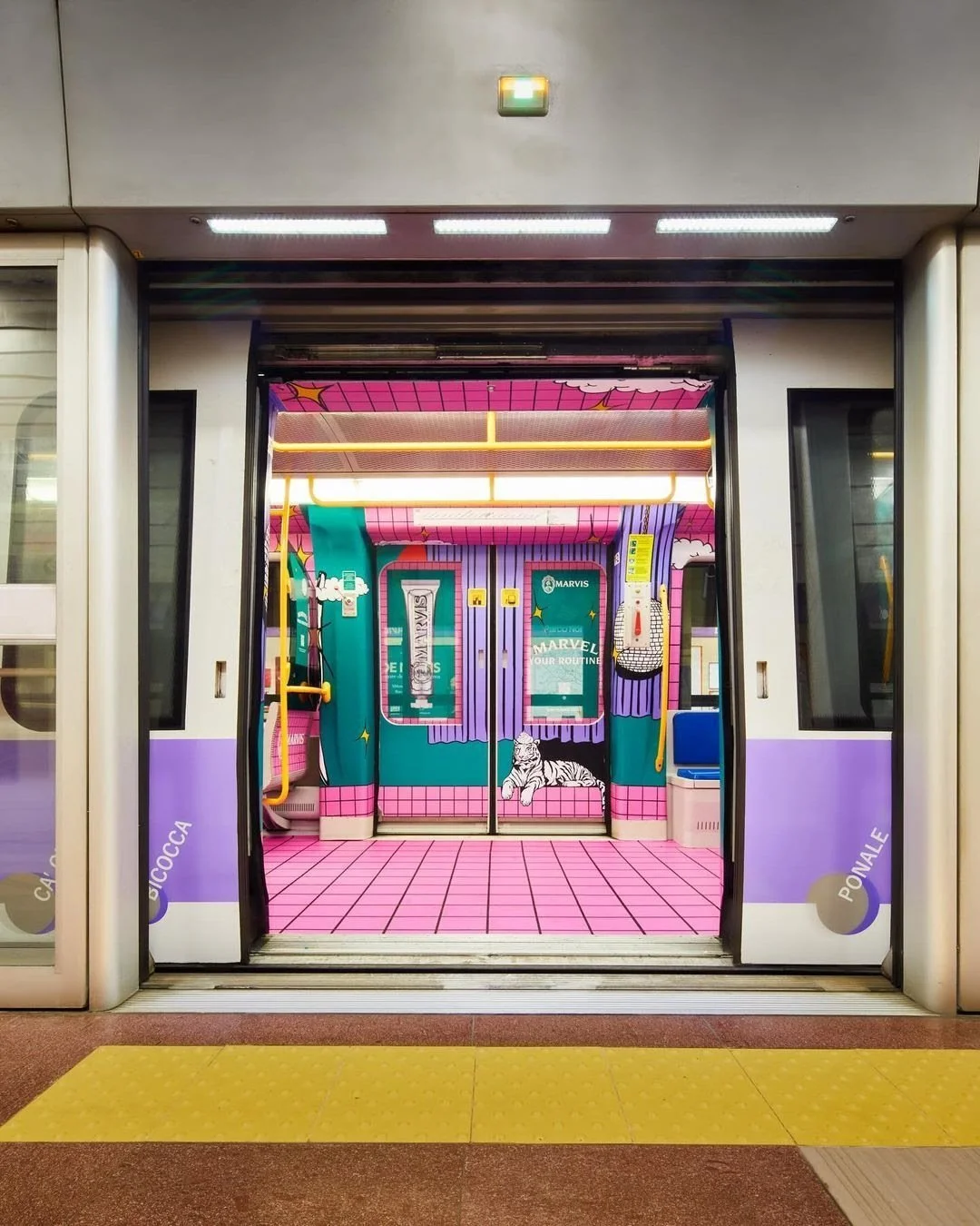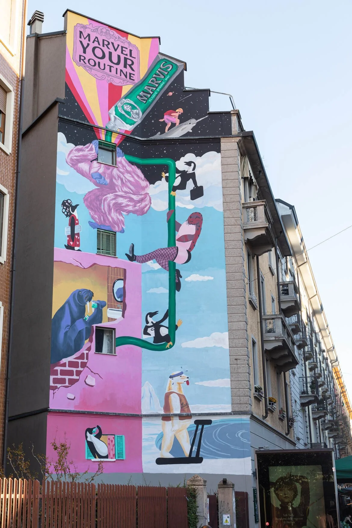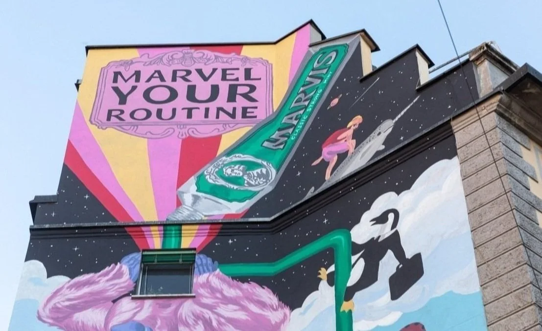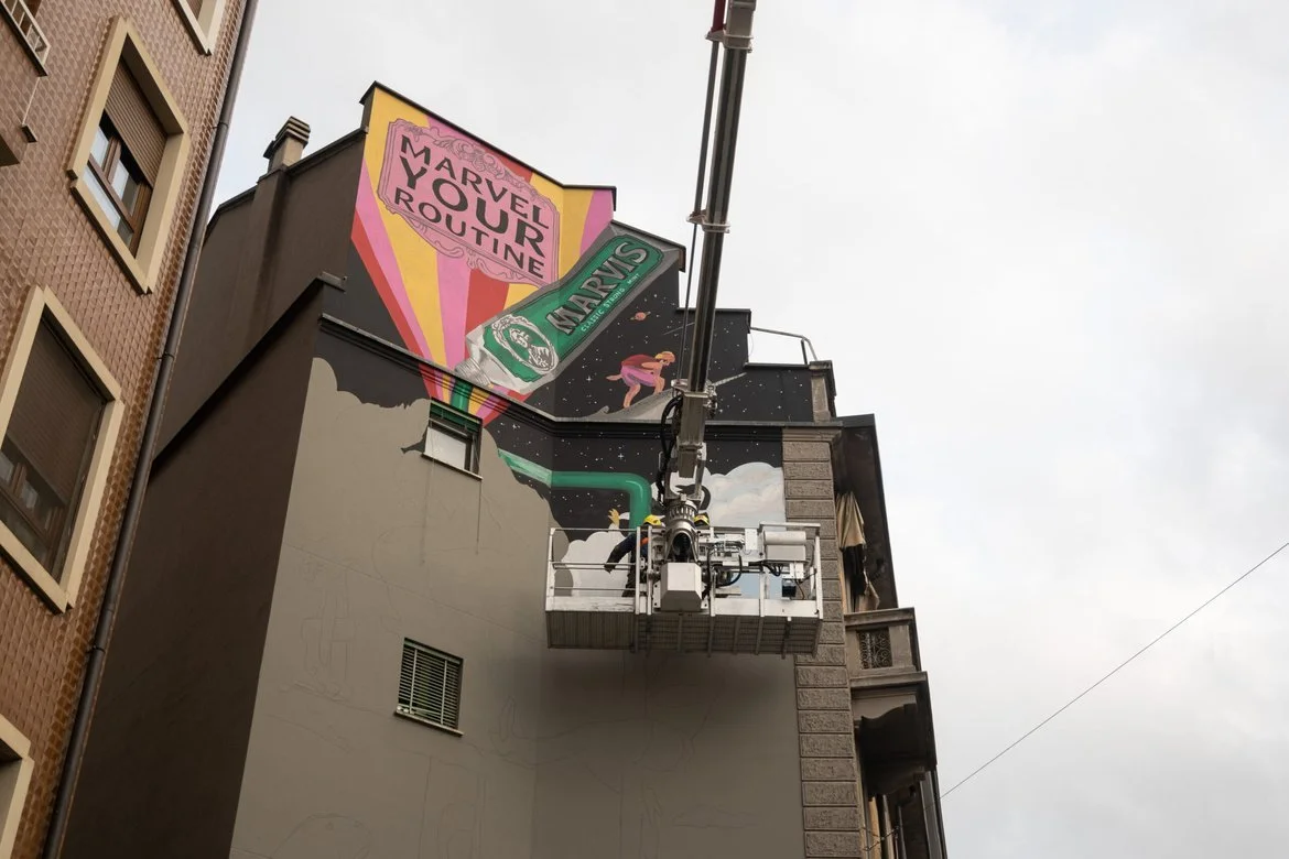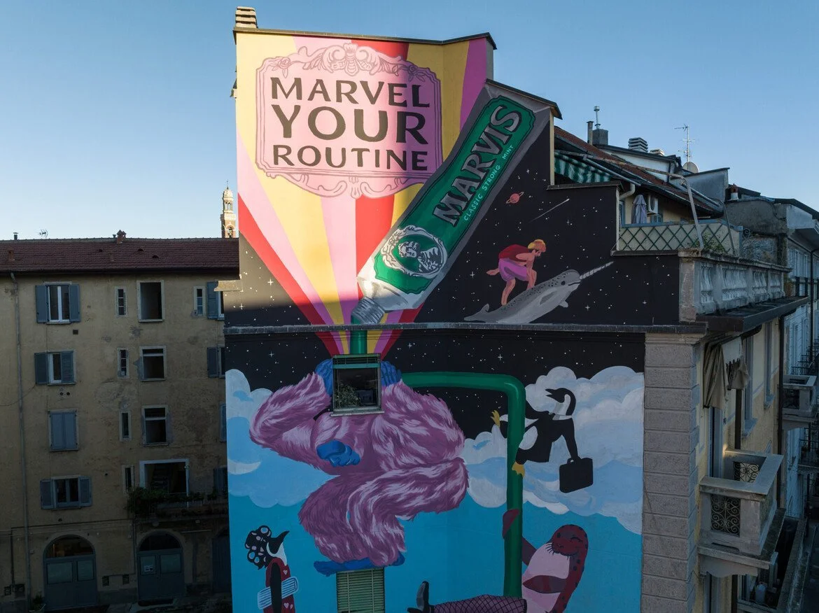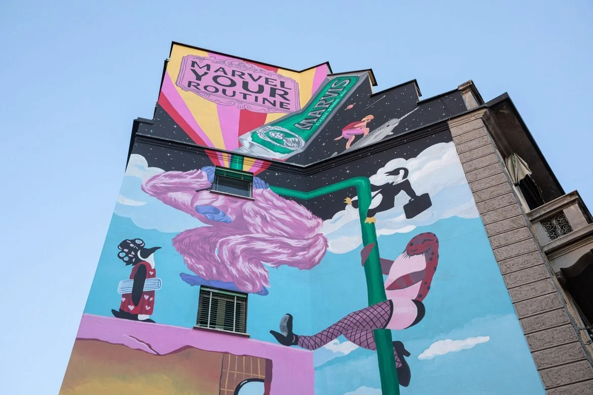Pocko was invited to collaborate with Marvis Toothpaste on their new irreverent campaign, ‘Marvel Your Routine’ Alongside the beautiful illustrations and animations produced, Sebastiano Fossali, one of the great illustrators commissioned for this project was tasked with the responsibility of designing 2 great Murals in the city of Milan.