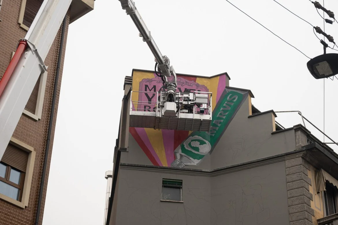 Sebastiano Fossali, uses his painterly and textured style to communicate Marvis’ playful personality which makes the brand stand proudly in the city and communicate a refreshing aura.