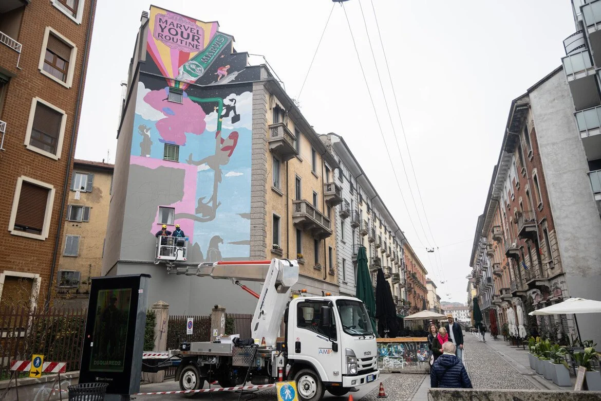Marvis의 도발적인 새 캠페인 ‘Marvel Your Routine’ 에 POCKO가 함께했다. 유쾌한 일러스트레이션과 애니메이션은 물론, 이번 프로젝트에 참여한 일러스트레이터 세바스티아노 포살리(Sebastiano Fossali)는 밀라노 도심에 두 점의 대형 벽화 작업을 맡았다. 첫 번째 벽화는 Navigli 지구의 Via Casale 거리, 두 번째는 밀라노 중앙역 한가운데 누구나 지나다니며 마주할 수 있는 압도적인 위치에 설치되었다.